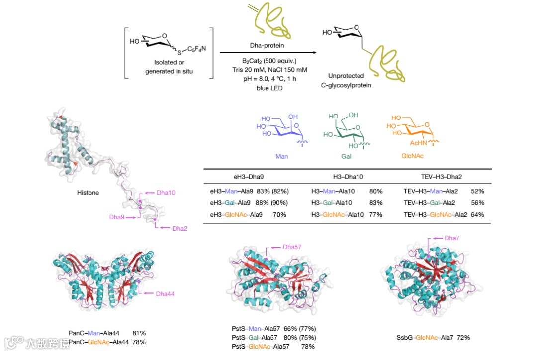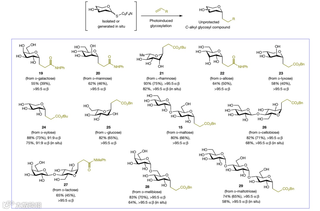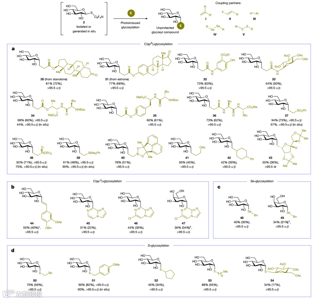 受生物催化S-糖苷化反应的启发,新加坡国立大学的许民瑜教授课题组发展了一种仿生“封端-糖基化(cap and glycosylate)”策略,成功地实现了天然糖类化合物位点选择性和立体选择性的糖苷化转化(图1c),全过程无需金属催化和保护基操作。具体而言,首先是“封端(capping)”,天然糖中的异头羟基(半缩醛)经仿生催化的S-糖基化反应产生硫代糖苷中间体;然后是“糖苷化(glycosylation)”,该硫代糖苷中间体经光活化后可与多种亲电试剂进行立体控制的脱硫自由基交叉偶联反应,从而以高产率、高区域选择性和立体选择性获得一系列C-、S-、Se-和O-糖基化合物。此外,该方法还能用于在水相蛋白质的直接翻译后糖基化,进一步展现出该方法的实用性和该类新型糖给体优异的生物相容性。相关成果于近日发表在Nature 上,许民瑜教授和the Rosalind Franklin Institute及英国牛津大学的Benjamin G. Davis教授为通讯作者。文章第一作者是许民瑜组博士生蒋仪(目前Davis组博士后),共同第一作者为许民瑜组博士后魏怡(现任中南民族大学副教授)。