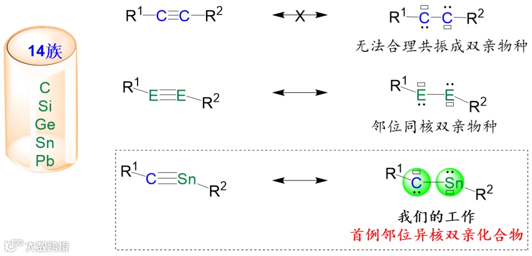 在邻位“异核双亲性”元素领域取得进展,合成了锡炔分子(