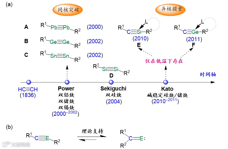 C=E)(图2b)。这一特性增加了稳定和分离异核炔烃类似物的难度,使得它们的研究具有极高的挑战性。