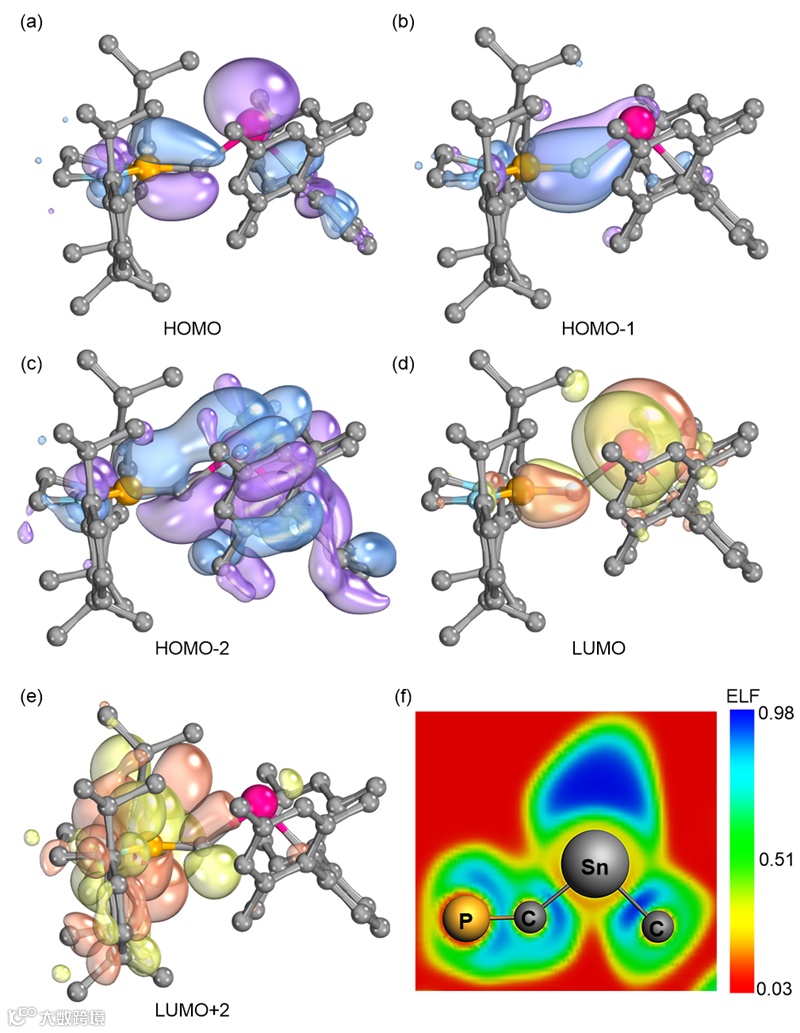 的最低未占据轨道(LUMO)为C(1)−Sn(1) π*和P−N σ*反键轨道组合而成,且具有显著的Sn(1)空5p轨道特征(图5d)。LUMO+2显示出P(1)−C(1) π*反键轨道(图5e)。FMO分析揭示了