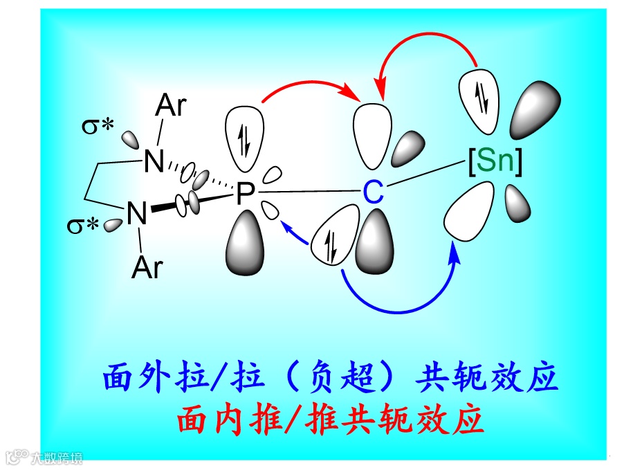 的电子结构主要包含了两个离域的体系(图7)。在PCSn面外,C(1)的电子既离域到P−N σ*反键轨道(负超共轭效应),也离域到Sn(1)的空5p轨道(共轭效应)。在PCSn面内,Sn(1)和P(1)的孤对电子会离域到C(1)形式上空的2p轨道(共轭效应)。这种电子的推拉效应,为进一步设计异核双亲性体系提供了理论基础。