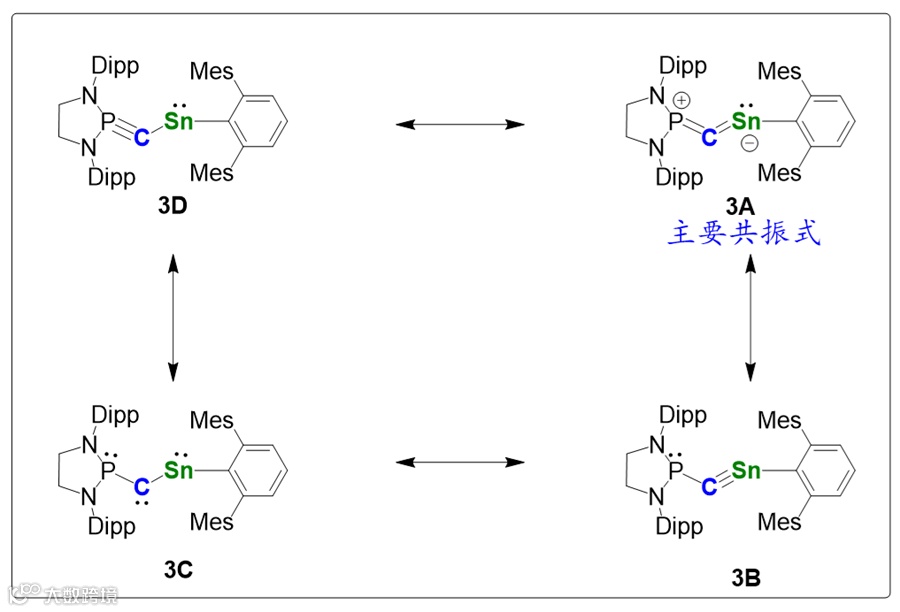 中碳和锡均具有双亲性,并且P(1)−C(1)−Sn(1)链存在多重键特征。此外,由于电正性Sn(1)取代基的影响,C(1)具有反电子态(