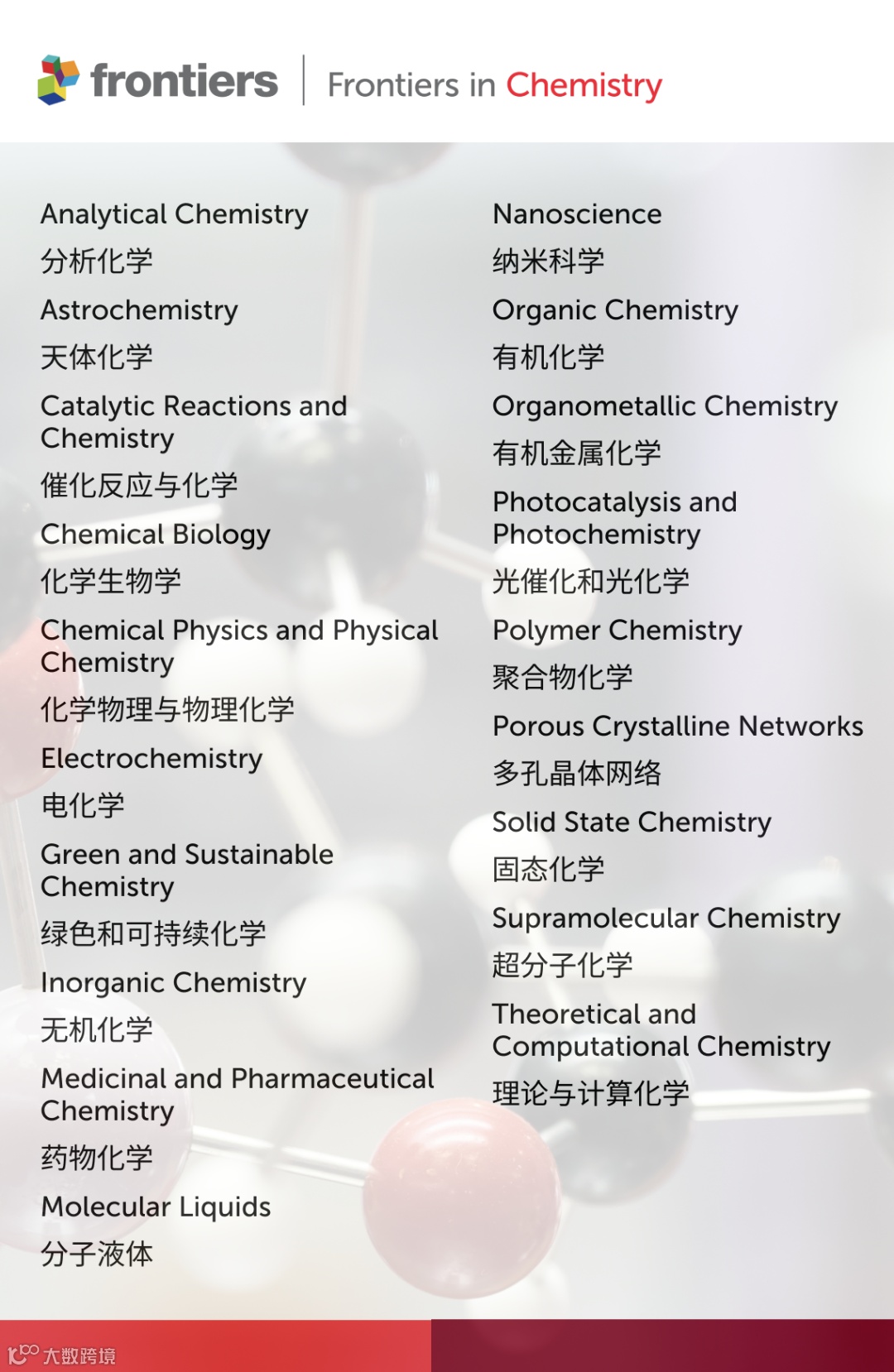 Frontiers in Chemistry 是瑞士出版社 Frontiers 旗下的开放获取期刊。本刊出版经过严格同行评审的化学相关文章,发表关于化学各个方面的原创研究文章、评论文章、评论。该期刊涵盖化学科学的所有领域,旨在增进我们对原子、离子和分子如何结合和分离的理解。