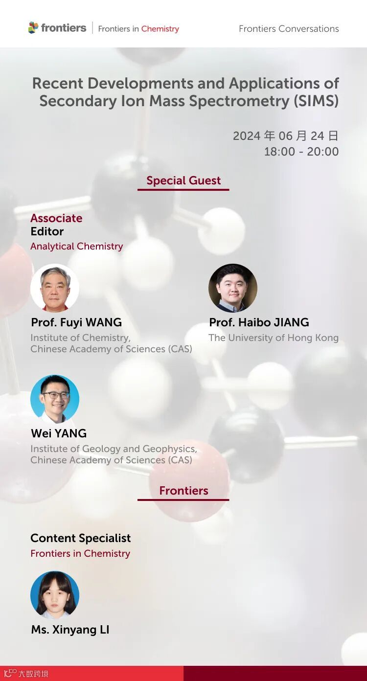 本期 Frontiers Conversations 邀请到 Frontiers in Chemistry (IF: 5.5|CiteScore: 8.5) 期刊栏目副主编(Associate Editor)中国科学院大学化学科学学院的汪福意教授,中国科学院地质与地球物理研究所的杨蔚研究员和香港大学的蒋海波教授。三位将围绕二次离子质谱技术的最新进展及其应用展开分享。