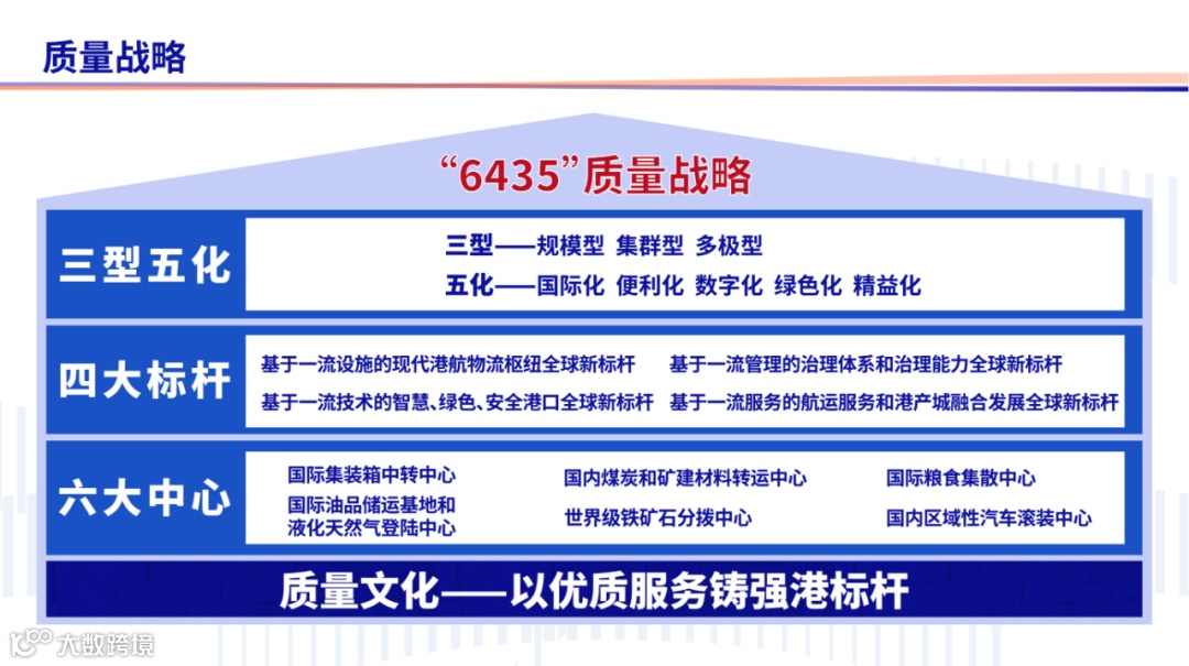 质量是企业赖以生存和可持续发展的根本保证。质量战略作为“强港兴业”战略的重要组成部分,是集团打造世界一流强港、发挥“硬核”力量的重要保障。宁波舟山港从籍籍无名的地方港口发展成为世界第一大港,始终视质量为生命,把诚信放在心上,用创新铸就一流,努力践行“6435”质量战略。作为股份公司股权投资项目开发和管理部门,下一步,我部将不断增强使命担当,强化质量意识,实践“一核四共双循环”质量管理模式,按照“强港兴业”战略的总体要求,以“四个一流”为目标,积极实施“6435”质量战略,优化港口物流设施的布局,完善港口物流供应链,增强港口物流竞争力,为集团打造世界一流强港和世界一流企业贡献“硬核”力量。