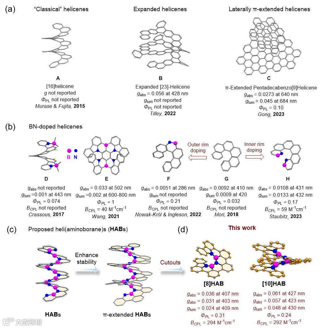 导读:香港大学刘俊治团队在深入研究的基础上提出了一类全新的螺旋结构,其中螺旋内缘的碳原子完全被交替的BN原子取代,命名为“内螺氮硼烯(heli(aminoborane)s,HABs)”
