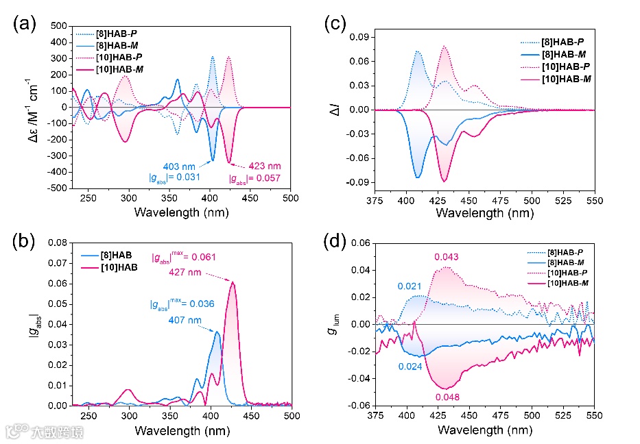 ),并对其进行了圆二色性(CD)和圆偏振发光性能(CPL)的表征。所有对映异构体在紫外到蓝光区均表现出强烈的科顿效应,其CD谱响应波长随螺旋数目的增加而逐步红移,