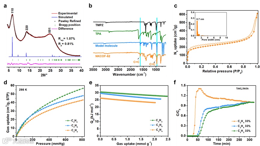 吸附和分离性能(图3)。NKCOF-62不仅可用于从