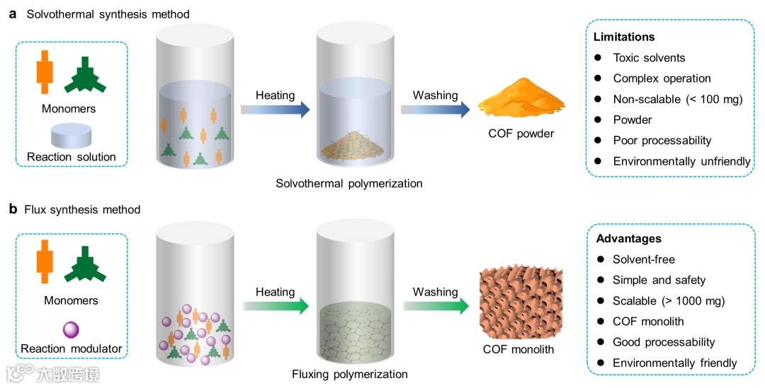 图1. 传统溶剂热法(a)与熔融合成法(b)的对比