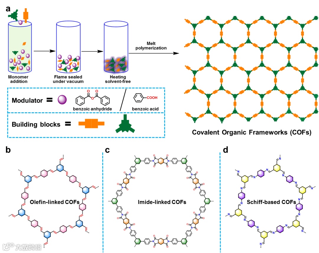 导读:南开大学化学学院张振杰教授课题组创新性地提出了一种基于熔融聚合原理的熔融(助熔)合成法,成功实现了多种键型的COFs制备