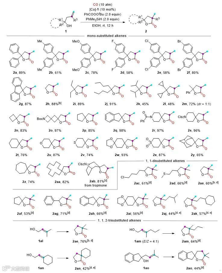 综上所述,程立杰教授团队使用廉价金属钴作为催化剂,开发了一种新型的非活化烯烃的马氏氢羰基化方法。该方法适用于单取代、二取代和三取代烯烃,并且具有良好的官能团兼容性,可以以较好的收率获得多种