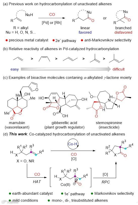 基于钴催化氢转移(HAT)以及自由基极性交叉(RPC)策略,首次实现了廉价金属催化非活化烯烃的分子内马氏氢羰基化反应