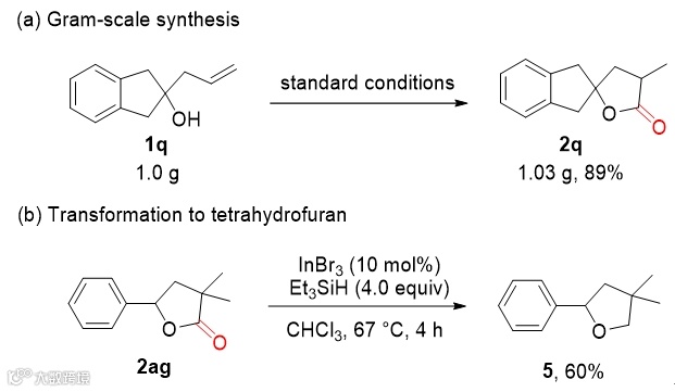 随后,作者为了进一步展示该方法的实用性,进行了克级规模反应,仍可以以较高的收率(89%)得到目标产物。该产物可以被进一步还原得到二取代的四氢呋喃结构(图5)。