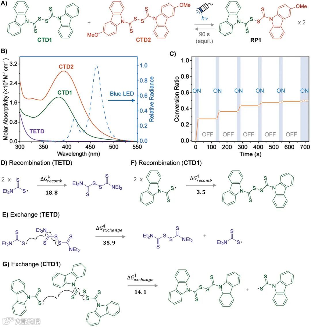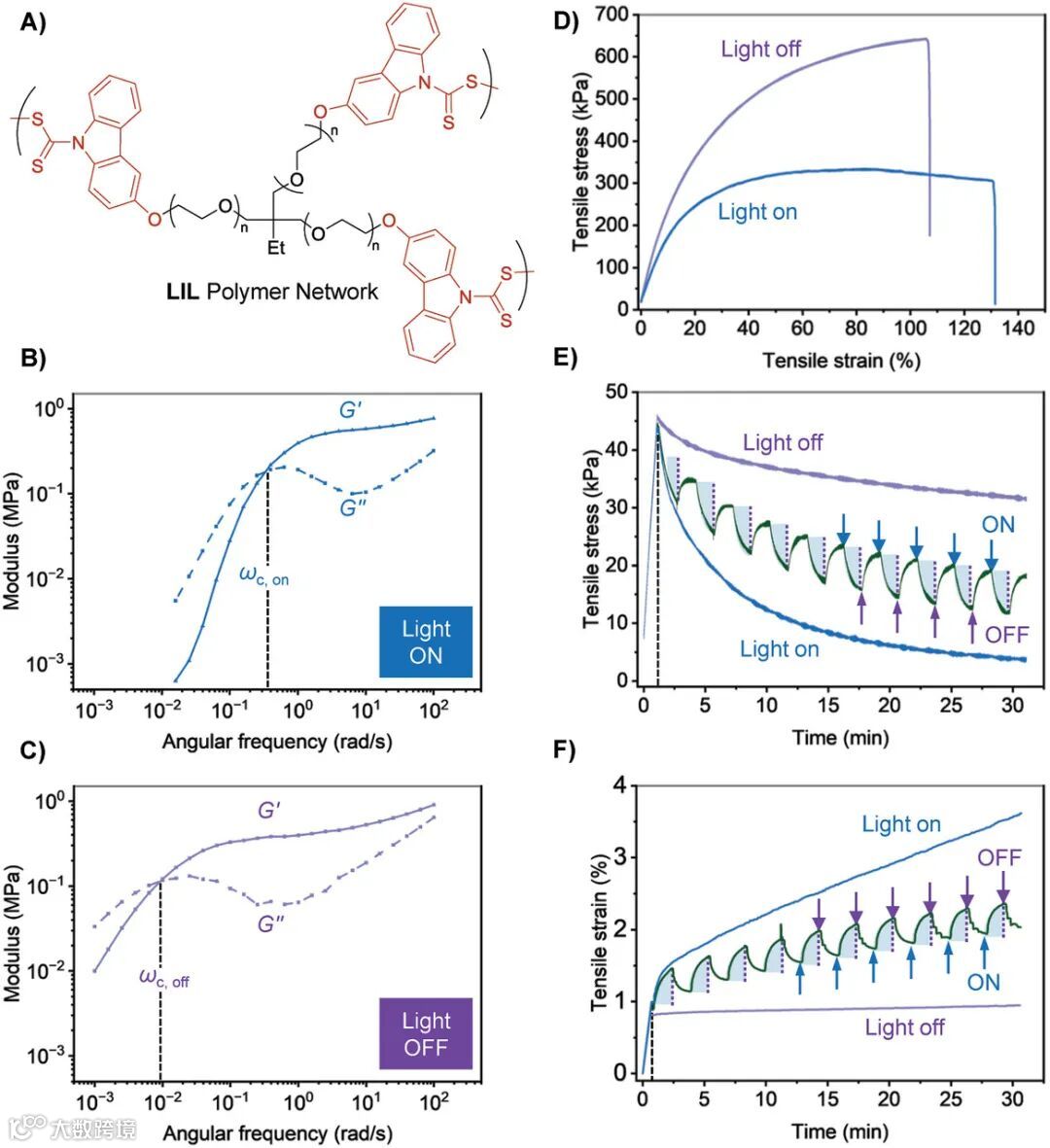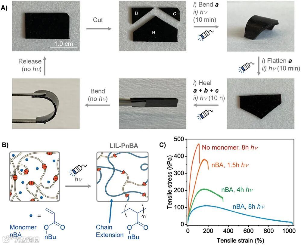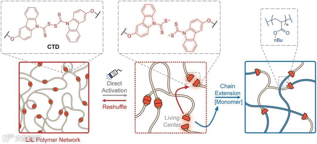在这一工作中,研究团队在聚合物骨架中引入可见光激活的CTD动态键,因此赋予了活性聚合物网络在光照下的快速响应性。利用CTD的可逆交换反应,该活性聚合物网络可在不改变机械性能的情况下愈合、变形。而CTD引发活性聚合的特性可以可控地改变聚合物网络的拓扑结构从而改变材料机械性能。研究团队相信该新型动态键有望拓展聚合物网络材料在自修复、4D打印、形状记忆等诸多前沿领域的应用。
