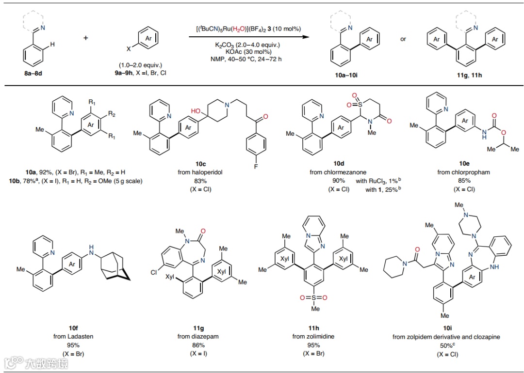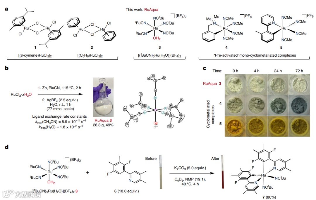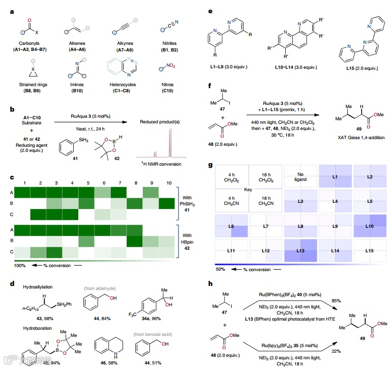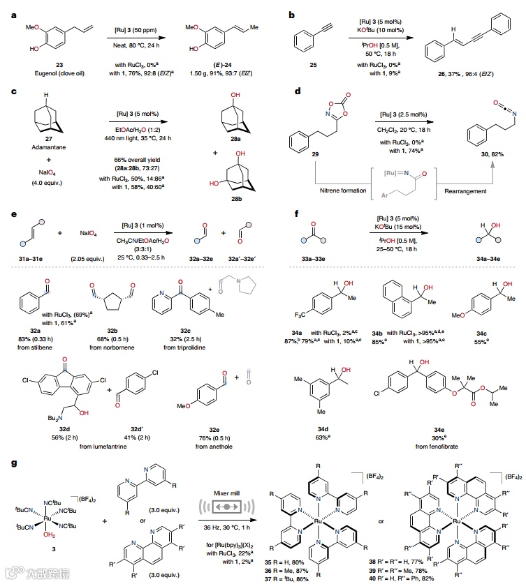 Igor Larrosa教授课题组开发了一种对空气和水汽稳定的高反应性钌预催化剂RuAqua 3,可驱动一系列转化,包括:后期C(sp2)-H键芳基化、一级/二级烷基化、甲基化、氢/氘交换、C(sp3)-H键氧化、烯烃异构化和氧化裂解,并且催化性能始终优于传统的钌(预)催化剂。此外,该预催化剂还可以促进高通量筛选并通过催化剂选择加速反应优化,从而为发现和开发可广泛使用的钌催化合成转化提供了一个平台。