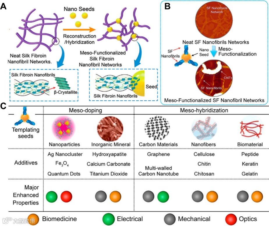 该综述提出,蚕丝的结晶网络结构在赋予材料稳定的机械、电学和光学性能方面起着关键作用。柔性材料的宏观性能是由材料的介观结构决定的。其中,β-微晶对于稳定蚕丝材料的介观结构起着至关重要的作用。通过分子或纳米功能种子进行模板成核,可以改变重折叠路径,从而重建蚕丝材料的多级结构。这种重折叠途径可以将不同的分子或纳米颗粒以模板成核的方式复合到蚕丝分子的结晶网络结构中,如图2所示。