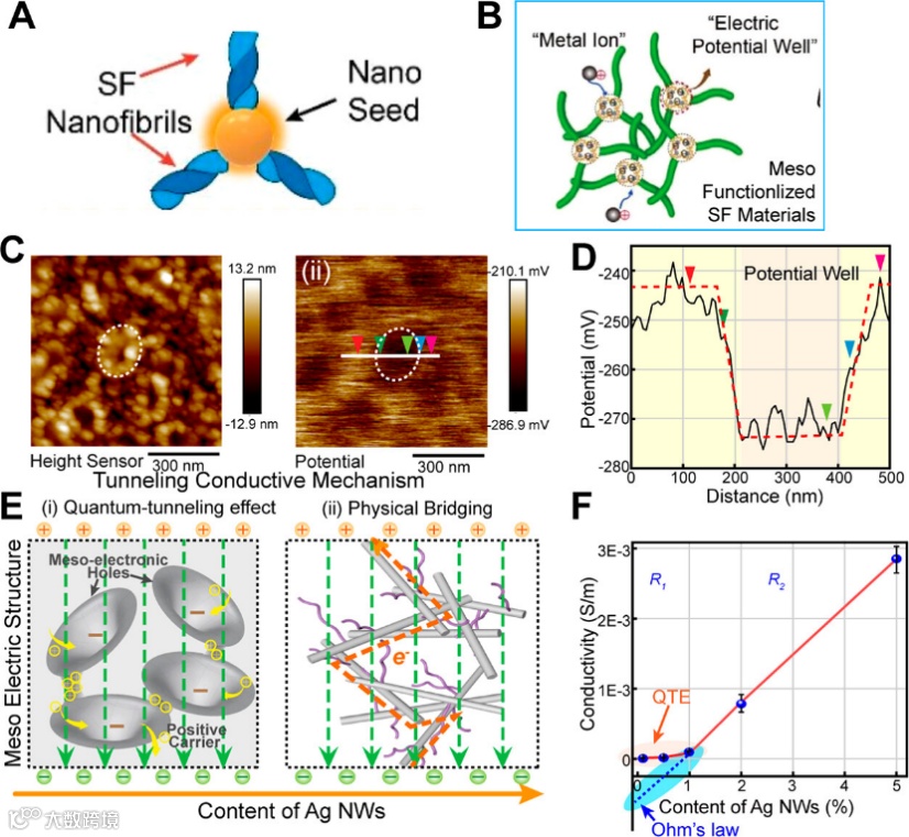 图3. 蚕丝材料介观网络和电子结构以及介观导电机制