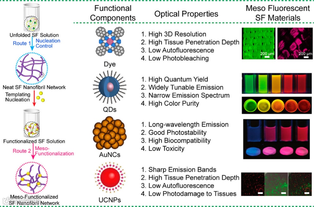 该综述还指出,蚕丝基介观光学结构的特点是将特定功能的纳米级种子,如量子点(QD)、上转换纳米颗粒(UCNP)和碳点(CD)以成核模板的形式加入到蚕丝材料的晶体网络和纳米纤丝网络中,如图4所示。