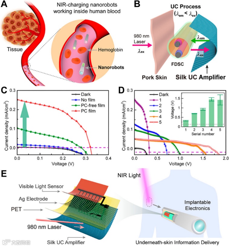 特别的,具有优异光学性能和生物相容性的蚕丝光子晶体可以与上转换纳米颗粒(UCNPs)在介观尺度进行复合,并进一步用于在植入式医疗设备中实现皮下无线能量和信号传输。如图6所示,蚕丝基UCNPs可对在人体血液中运行的近红外纳米机器人的进行无线充电。其还可用于近红外光开关的指令编码,实现设备性能的隐蔽优化,增强安全和隐秘通信、数据加密以及秘密传感操作的有效性。此外,蚕丝基的柔性光子压力传感器具有抗信号衰减和高灵敏度的特点,可进一步用于空气和水下机械波(如声波)的检测。