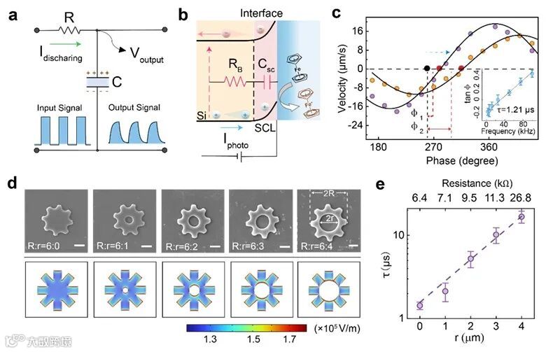 图2. 微纳米马达在相位-频率的响应关系以及对RC电路设计的验证实验。(a)在时域内工作的等效RC电路;(b)纳米马达-电解液界面的等效电路模型;(c)在50 kHz和75 kHz运动测试下的相位偏移和幅度衰减;(d)具有不同内径尺寸的同心孔齿轮状的硅纳米片;(e)硅纳米片的时间常数与同心孔半径的关系。