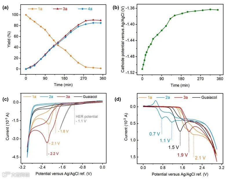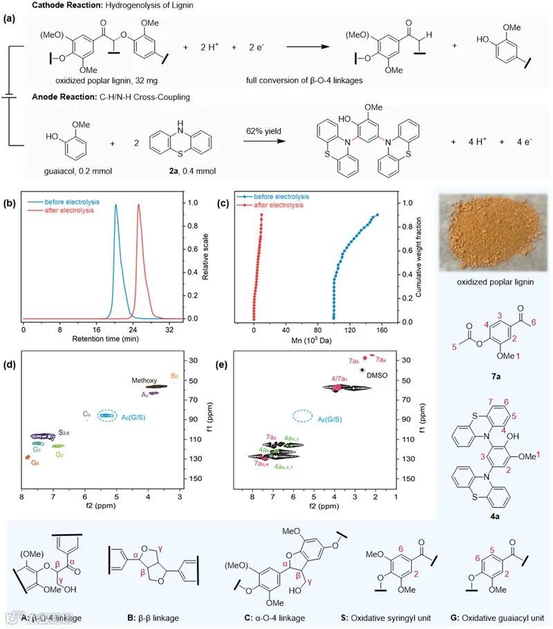 如图3所示,杨木木质素的分子量(Mn)在电解后显著降低,HSQC光谱分析显示该木素的β-O-4键被完全转化。与此同时,在反应后的溶液中检测到2 wt.%的解聚产物4-乙酰基-2-甲氧基苯基乙酸酯