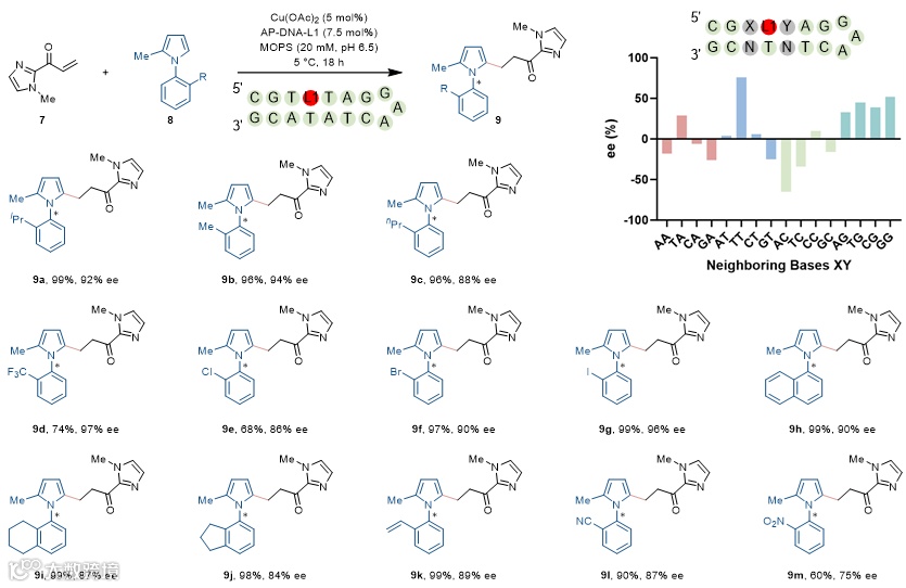 和N-芳基吡咯进行反应尝试,首次在DNA催化中实现轴手性的控制。