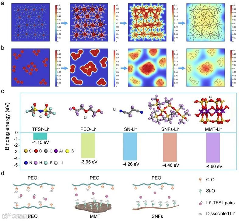 ,30 ℃)、锂离子迁移数(0.63)、氧化稳定性(5.3 V)和机械性能。结合分子动力学和DFT理论分析,揭示了锂离子在PEO/SNFs@MMT中的传输机制。以PEO/SNFs@MMT组装的Li/LiFeP