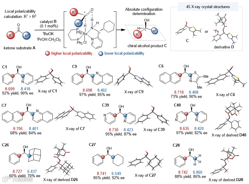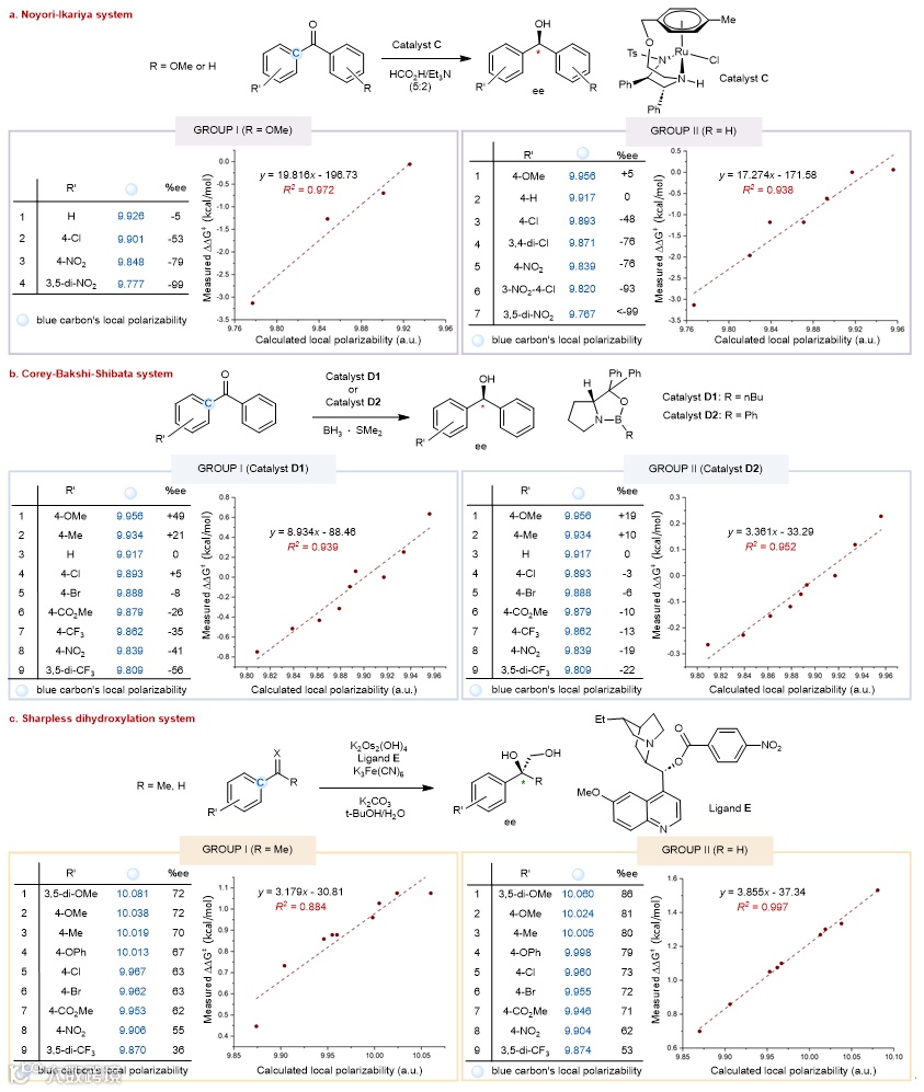 在定性研究的基础上,他们又以不对称转移氢化还原体系、CBS还原体系、以及Sharpless双羟化氧化体系为研究对象,对官能团电子极化率与对映选择性之间是否具有定量关系展开探究,其中,两个还原体系以结构高度可比的芳基-苯基酮为研究对象;Sharpless双羟化体系,以芳基取代的末端烯烃和芳基-甲基偕二取代烯烃为研究对象。令人欣喜的是,尽管上述三个体系机理不同,反应性质与反应条件各异,但是在这三个体系中,作者均发现羰基或烯烃取代基的电子极化率之间的差异,与产物的ee值之间存在明确的线性相关,其系数介于0.884值0.997之间。