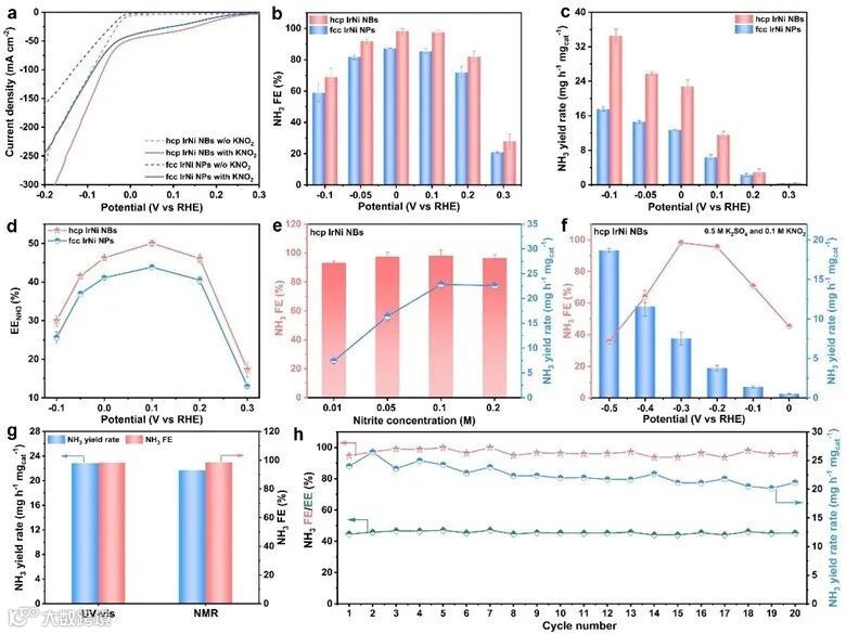 图2. hcp IrNi NBs在电催化亚硝酸盐还原反应中的性能测试结果。