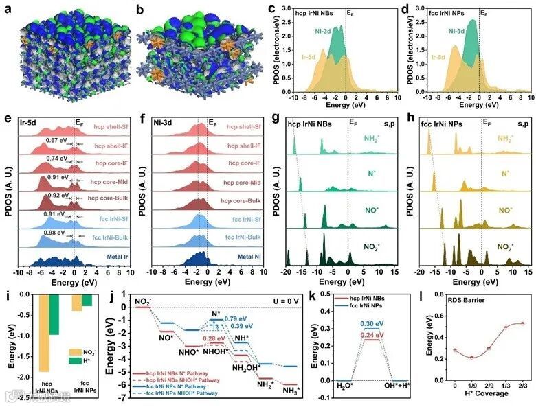 图3. hcp IrNi NBs在电催化亚硝酸盐还原反应中的理论计算结果。