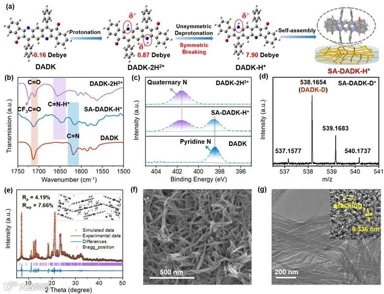 本文对合成的双茚并蒽唑啉化合物DADK通过非对称质子化驱动自组装方法制备了具有超细纳米纤维结构(图1f,图1g)的超分子光催化剂SA-DADK-