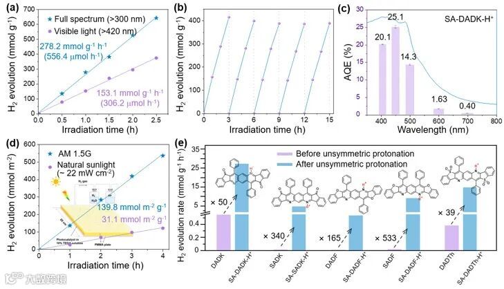 )和在450 nm处的显著表观量子效率(25.1%),在有机半导体光催化剂中处于领先地位。这项研究不仅将SA-DADK-