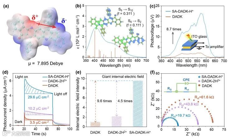 的电子跃迁主要归因于电荷转移型激子(CTEs)。通过密度泛函理论证明了催化剂分子偶极的增大(图2a)。表面光电压、表面电荷密度以及电化学阻抗表明非对称质子化后材料内建电场的大幅增强(图2c-图2f)。