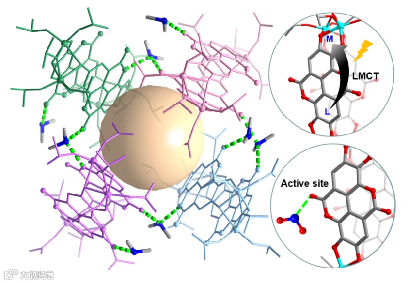 近日,中国科学院福建物质结构研究所王飞研究员,张健研究员等人合成了一例基于鞣花酸的可见光活性钛氧簇 [(CH3)2NH2]+2·[Ti4L2(OiPr)10]2−(化合物1,H4L = 鞣花酸),该化合物是通过四个Ti4L2簇与二甲胺阳离子通过氢键作用形成的类环糊精的四聚体。由于其具有良好的可见光吸收和丰富的未配位的氧位点,在作为痕量NO2检测的化学电阻传感材料显示出显著的优势。该化合物代表了首例可见光活性的TOC化学电阻传感材料,它在光活性方面扩展了TOCs的应用领域。
