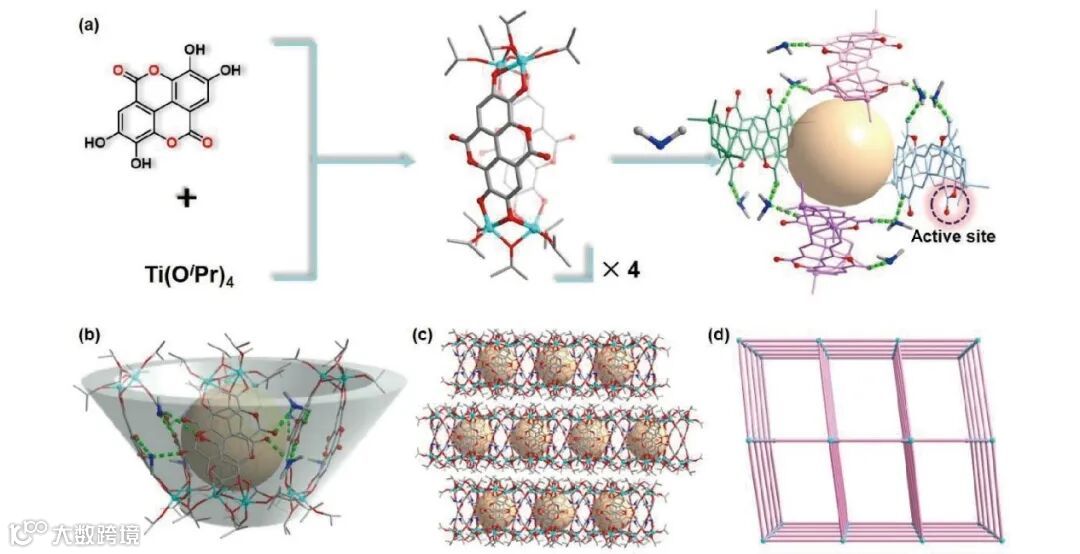 化合物1的晶体结构。Ti(OiPr)4和鞣花酸(H4L)在溶剂热条件下得到橙红色块状晶体(化合物1,[(CH3)2NH2]+2·[Ti4L2(OiPr)10]2−)。单晶X射线衍射(SCXRD)分析表明化合物1结晶于单斜晶系,空间群为C2/c。在1的结构中,两个相邻的钛原子被两个鞣花酸配体和一个异丙醇连接形成Ti2亚基,其余的位点是以异丙醇作为封端配体占据。两个Ti2亚基通过两个鞣花酸配体连接形成Ti4簇。每个Ti4簇作为超分子构筑单元。有趣的是,在每四个Ti4簇中,相对的两个Ti4簇中同侧Ti2亚基一端相互靠近以及另一端相互远离的方式排列。四个Ti4簇通过二甲胺阳离子与相邻的Ti4簇形成OH∙∙∙N氢键相互连接形成基于Ti4簇的类环糊精四聚体。这些四聚体通过简单立方(pcu)形式进行堆积。