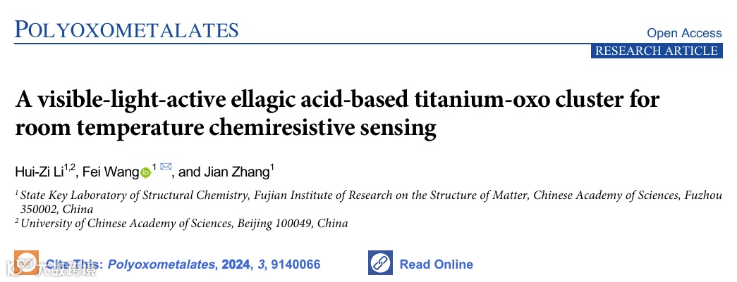 Hui-Zi Li, Fei Wang*, and Jian Zhang. A visible-light-active ellagic acid-based titanium-oxo cluster for room temperature chemiresistive sensing. Polyoxometalates, 2024, 3(3), 9140066.