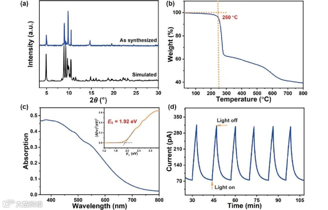 化合物1的基本表征。粉末X射线衍射(PXRD)结果证实了化合物1的相纯度。EDS图谱证实元素钛(Ti)、碳(C)、氧(O)和氮(N)均匀分布在化合物1中。化合物1的热重分析结果表明该结构可以维持在大约250 ℃,其具有良好的热稳定性。紫外可见(UV–Vis)吸收光谱显示化合物1在350–800 nm范围内具有较好的吸收。根据Tauc公式计算出化合物1的光学带隙(Eg)为1.92 eV。化合物1显示出较低的带隙,这主要是由于从多酚配体鞣花酸到高价钛离子的配体–金属电荷转移(LMCT)。化合物1的XPS Ti 2p区域显示出两个结合能分别为458.62 eV(Ti 2p3/2)和464.40 eV(Ti 2p1/2),对应于Ti4+的存在。光电导曲线表明该材料是具有可见光活性(l ≥ 420 nm)。在可见光照射下,LMCT促进化合物1的电子和空穴对产生和分离,表现出明显的光电流响应。