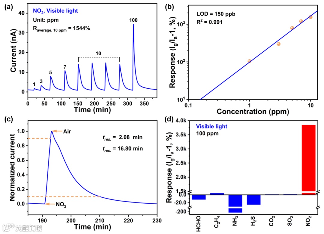 图3. 化合物1在可见光下的室温气体传感性能。(a) 对不同浓度的NO2的响应–恢复曲线。(b) 对不同浓度NO2的响应浓度对数–对数图。(c) 对10 ppm NO2的响应和恢复时间。(d) 对7种干扰气体的选择性。