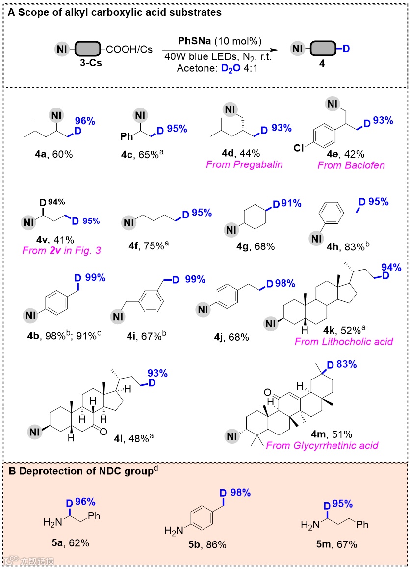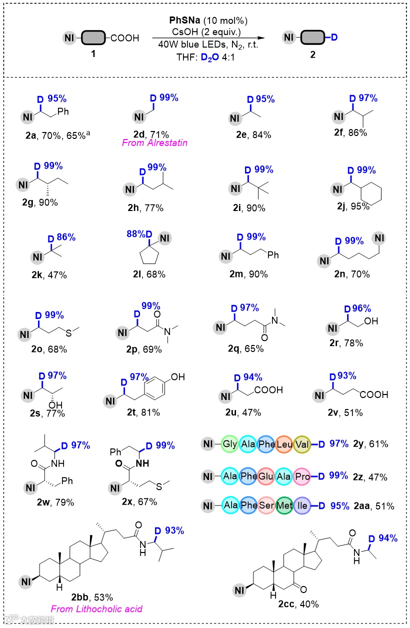 该方法表现出良好的底物适应性。一系列α-氨基酸衍生底物以及烷基羧酸等均经历了高效的脱羧氘化反应。特别值得注意的是,对于具有多个羧基的底物,完全选择性地进行了脱羧氘化反应(
