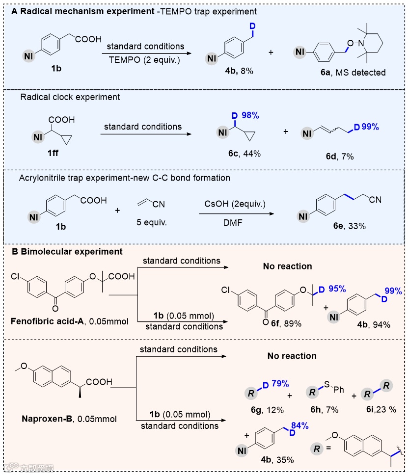 作者进行了TEMPO捕获以及自由基钟等实验,证实了自由基机理(图6A),并通过丙烯腈捕获自由基,观察到了新的C-C键形成。为了验证自催化路径,作者进行了双分子交叉反应实验,使用PAC-1b和常规羧酸以等摩尔比进行反应(图6B)。非诺贝特酸以及萘普生的高效脱羧氘代,进一步证实了所提出的双分子自催化脱羧机制。最终,作者根据实验结果提出一个可能的反应机理(图7)。