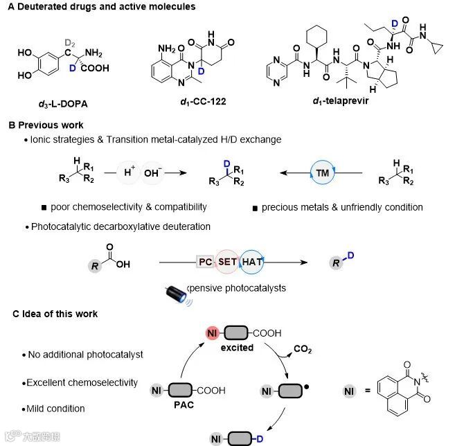 氘标记在合成化学、药物化学和有机材料等多个领域中发挥着不可或缺的作用(图1a)。传统的离子策略依赖于氘代强酸或强碱,存在官能团耐受性差和化学选择性不受控的问题。近几十年来,过渡金属催化的氢/氘交换方法成为氘代反应的主要方法,但过渡金属催化剂通常存在成本高、合成困难及产生危险废物等问题(图1b)。在过去十年中,光催化单电子转移(SET)诱导的脱羧氘化反应取得了显著进展,但光催化剂通常包括稀有金属复合物或复杂合成的有机染料,限制了其在广泛工业过程中的应用。针对这些问题,作者通过将萘酰亚胺(NI)光敏砌块整合到羧酸分子中,使其具有多重功能,既作为保护基团也作为光敏基团,从而实现了精确的自催化脱羧氘化(图1c)。