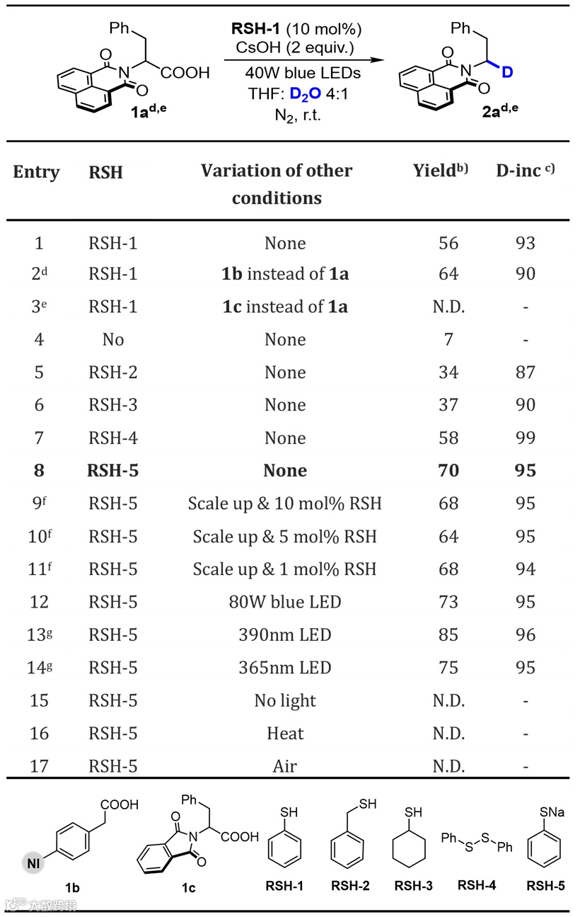 在进一步条件优化中,作者对硫醇、溶剂、碱以及光源等进行了筛选(图3)。其中,硫醇在转化中起到了关键作用,使用硫酚钠作为DAT催化剂显著提高了反应产率和氘的掺入。该结果归因于两方面:一是硫苯酚引入的氢原子减少,其次是PAC与苯硫酚钠形成的电子给体-受体(EDA)复合体,进一步增加了系统在可见光谱中的吸收,从而提高了反应的效率(图2b)。