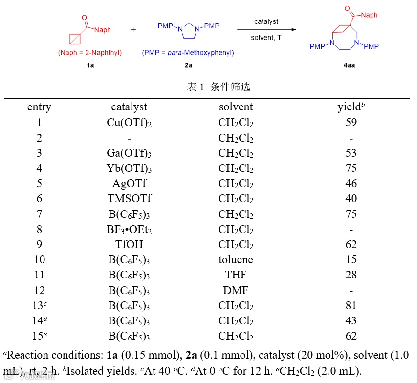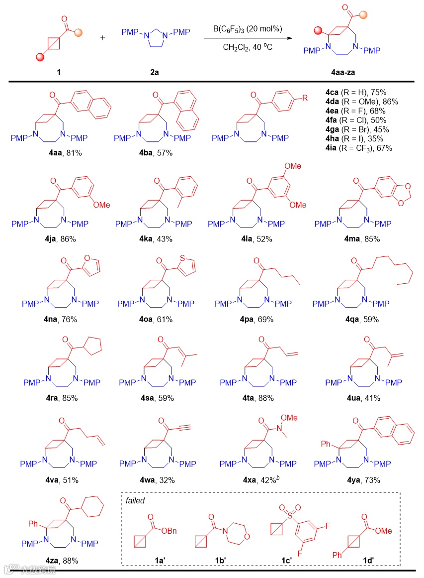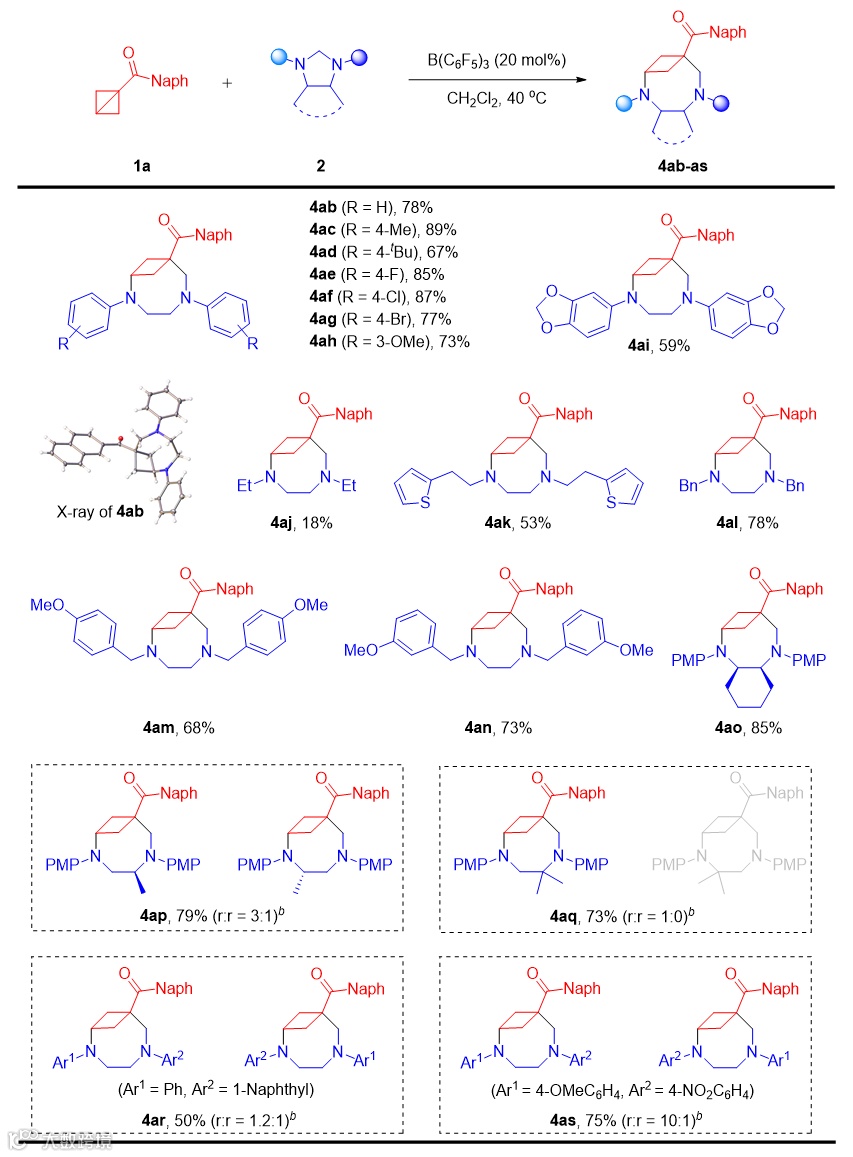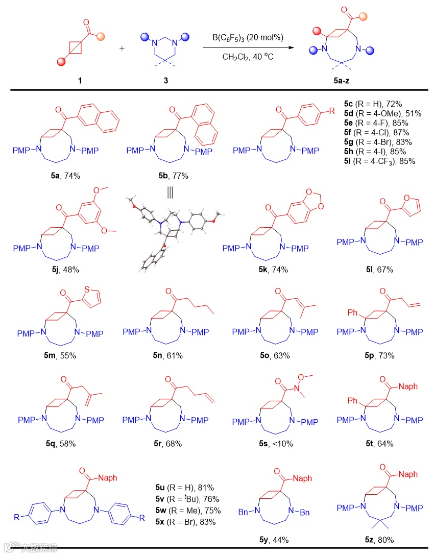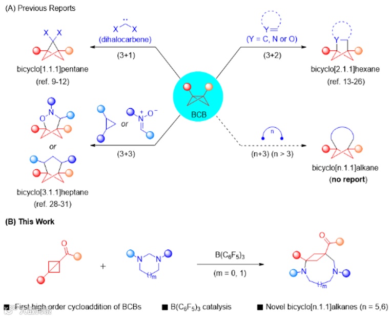 彭士勇课题组报道了在温和的条件下以非金属路易斯酸B(C6F5)3为催化剂,实现了咪唑烷与双环[1.1.0]丁烷的(5+3)偶极环加成反应,反应具有优良的底物普适性。进一步地在该条件下实现了六氢嘧啶与双环[1.1.0]丁烷的(6+3)偶极环加成反应,得到了一系列2,6-二氮双环[6.1.1]癸烷化合物。据作者所知,这是双环[1.1.0]丁烷参与的首次高阶偶极环加反应,为以后基于双环[1.1.0]丁烷参与高阶偶极环加成反应打下了基础。