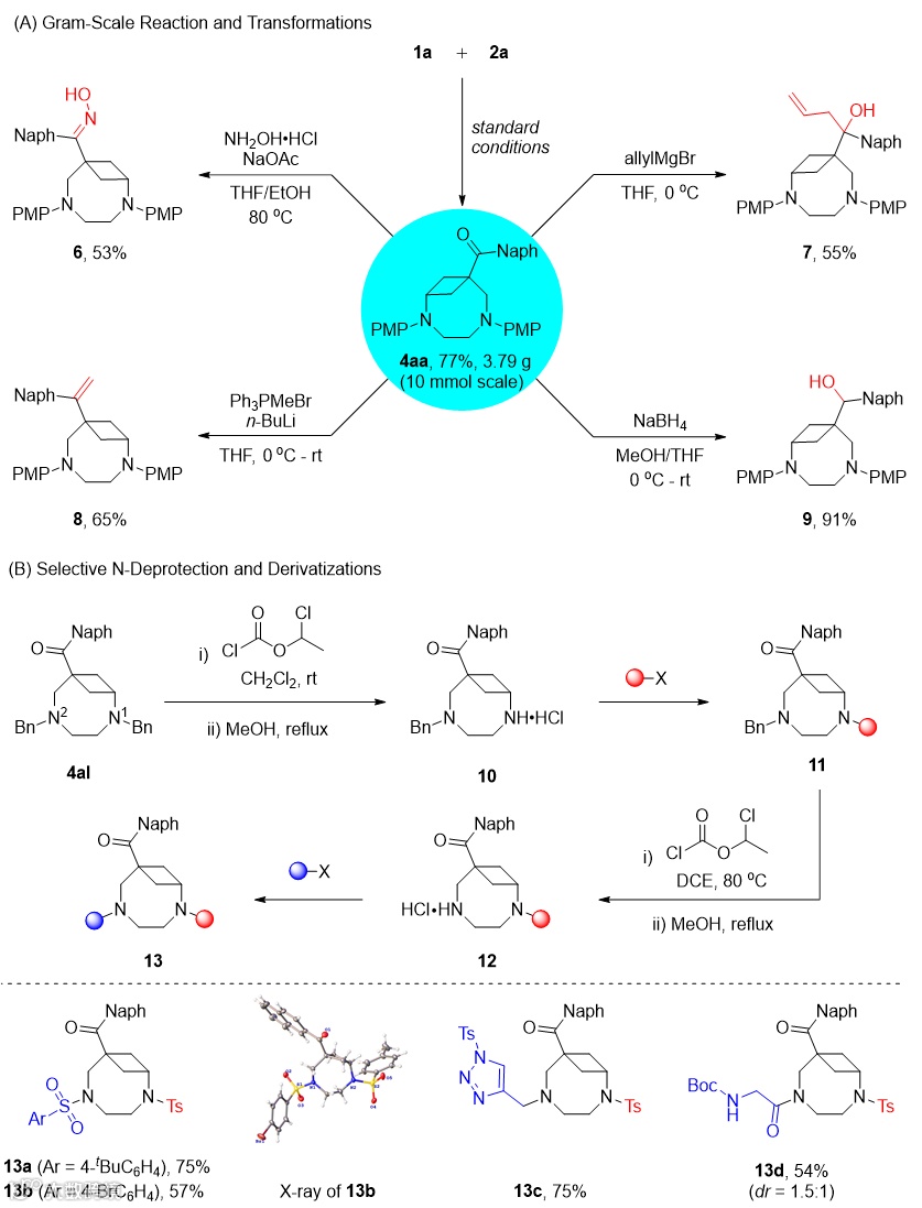 随后,作者进行了毫摩尔级放大反应以及产物的多样性转化,在10 mmol的反应规模下,标准条件下依然能以77%的收率获得目标产物,产物4aa的羰基可以高效的发生缩合反应、格氏反应、Wittig反应以及氢化反应,且桥环骨架并未受到影响。最后通过使用氯甲酸氯乙酯经过两步一锅法以定量的收率得到选择性苄基脱除的产物,进而能够选择性的在桥环氮原子上引入药效分子,展示了其在合成中的潜在应用性 (图5)。