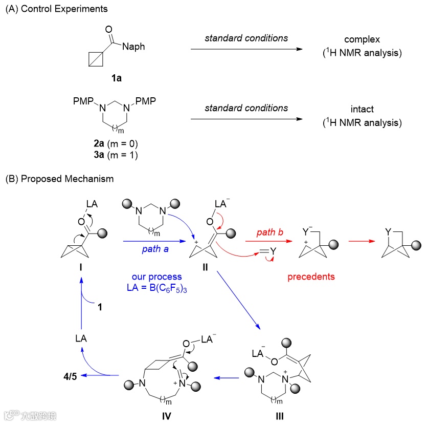 最后,作者通过设计对照试验,证明该反应是通过路易斯酸B(C6F5)3对BCB进行活化进而受到咪唑烷的亲核进攻而发生环化的反应路径获得目标分子,而非此前由Leitch、Studer以及Glorius所报道的BCB开环生成偶极子再去进攻另一底物的方式。根据实验结果,作者提出了可能的反应机制 (图6)。
