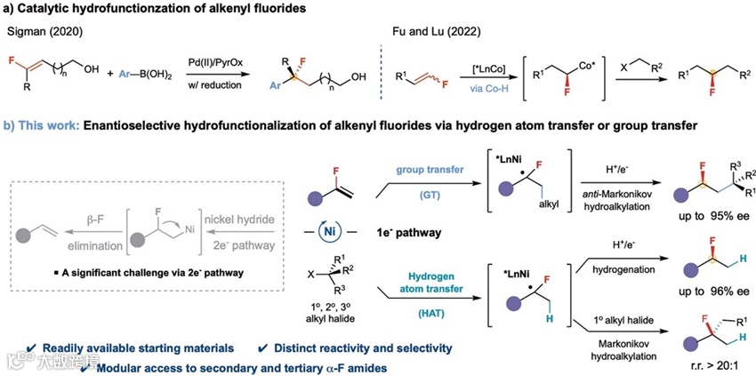 图1. 镍催化氢原子和基团转移实现烯基氟化物的选择性氢官能化反应