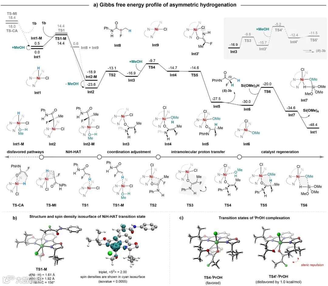 对于烷基转移反应,基于系列机理实验(自由基钟、KIE、动力学等),作者推断可能通过类似的自由基转移途径进行。DFT计算则表明,不对称烷基转移反应的机制更为复杂,经历Ni(0/I/II)价循环(图8a)。该反应从Ni(0)启动,Ni(0)与叔丁基溴发生卤素原子转移反应(XAT),生成Ni(I)和叔丁基自由基,后者与烯基氟发生自由基加成。后续反应过程和上述NiH-HAT类似。手性决定步中的优势过渡态