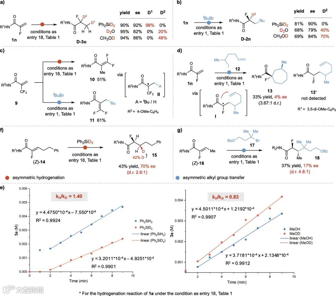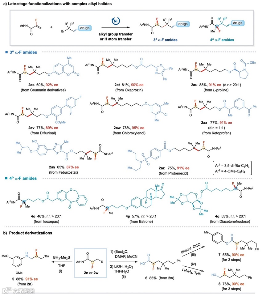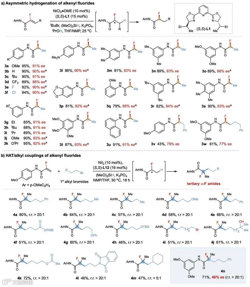 镍催化自由基转移策略,成功实现了α-F丙烯酰胺的不对称氢原子转移和不对称烷基转移。