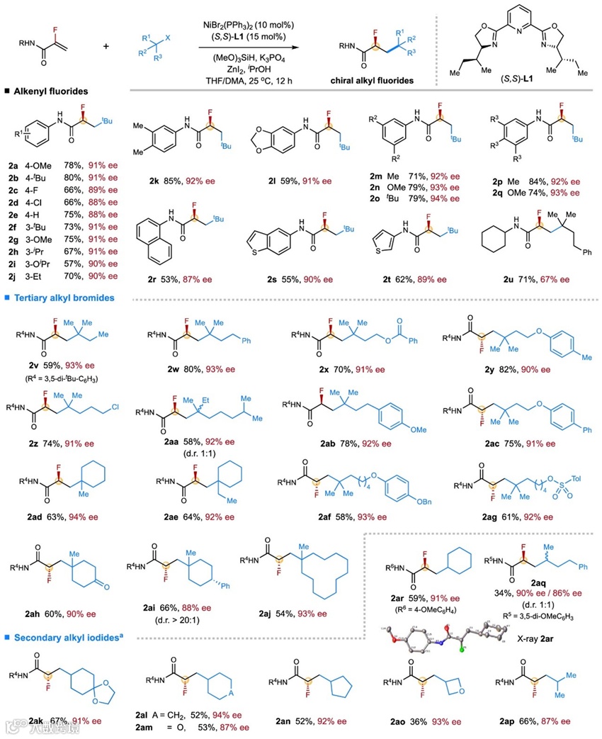 -芳香取代基的α-氟代丙烯酰胺均可在温和的条件下与仲碳、叔碳烷基卤化物发生反应,以良好的产物、优秀的对映选择性得到相应的手性仲碳氟化物(高达94% ee)。该反应兼容环状、链状烷基卤,为发展不对称Giese加成反应提供新思路。