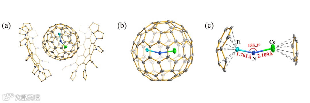 图注:(a)TiCeN@C1(12)-C84·2DPC晶体学结构示意图。 (b) TiCeN@C1(12)-C84的分子结构。(c) 和碳笼最近片段相互作用的TiCeN团簇示意图。灰色:C;蓝色:N;绿色:Ce;青色:Ti。